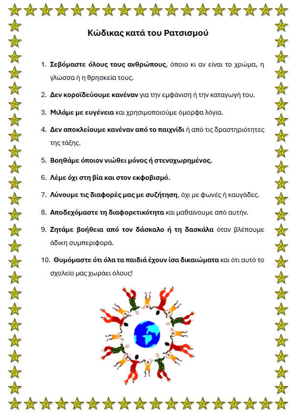 Οι μαθητές και οι μαθήτριες του σχολείου μας δημιούργησαν με ενθουσιασμό έναν Κώδικα κατά του Ρατσισμού, στέλνοντας ένα δυνατό μήνυμα σεβασμού, αποδοχής και ισότητας. Με υπευθυνότητα και συνεργασία, κατέγραψαν αξίες και κανόνες που προάγουν τη φιλία, την κατανόηση και τη συμπερίληψη όλων, χωρίς διακρίσεις.